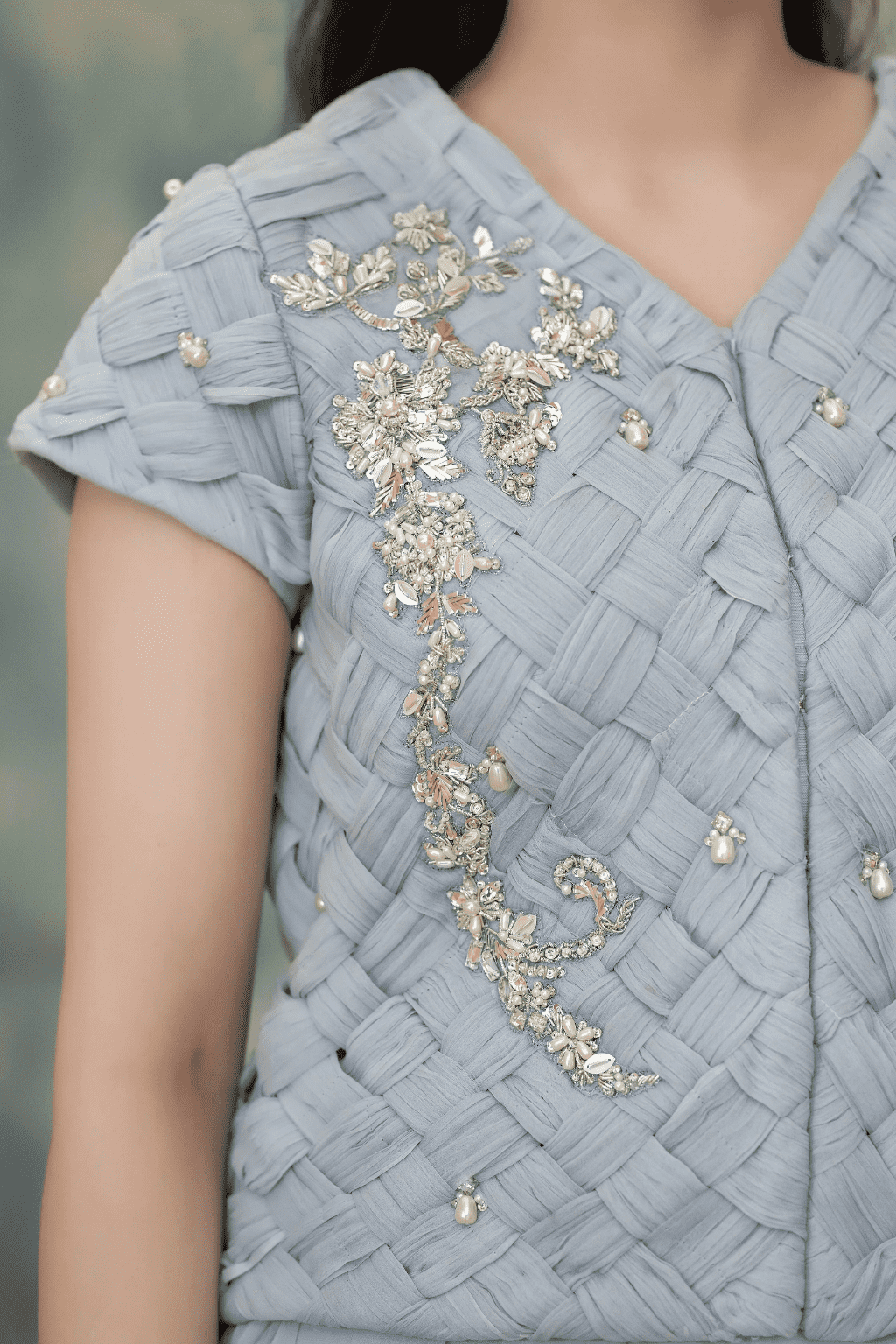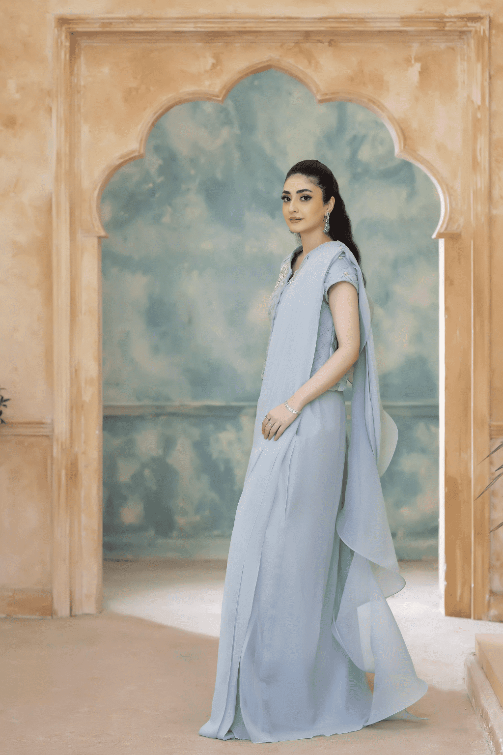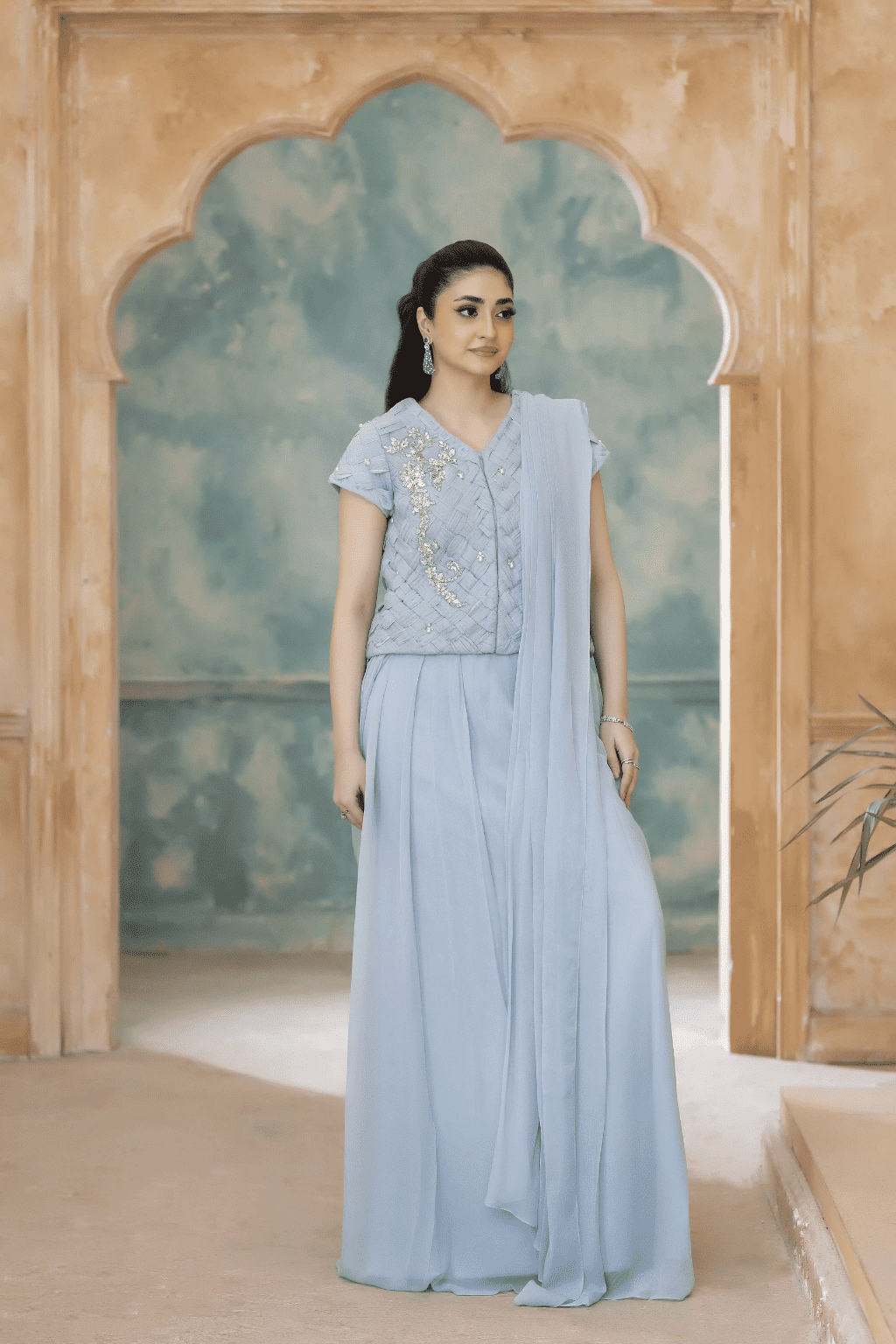 A serene powder blue ensemble featuring a uniquely textured crisscross embellished blouse. The blouse is adorned with intricate hand-worked floral motifs, paired perfectly with a fluid chiffon draped skirt and a matching dupatta for a graceful, modern silhouette.