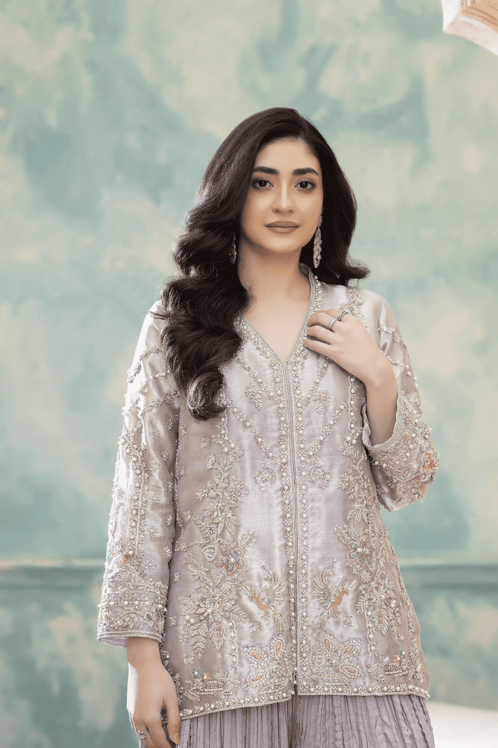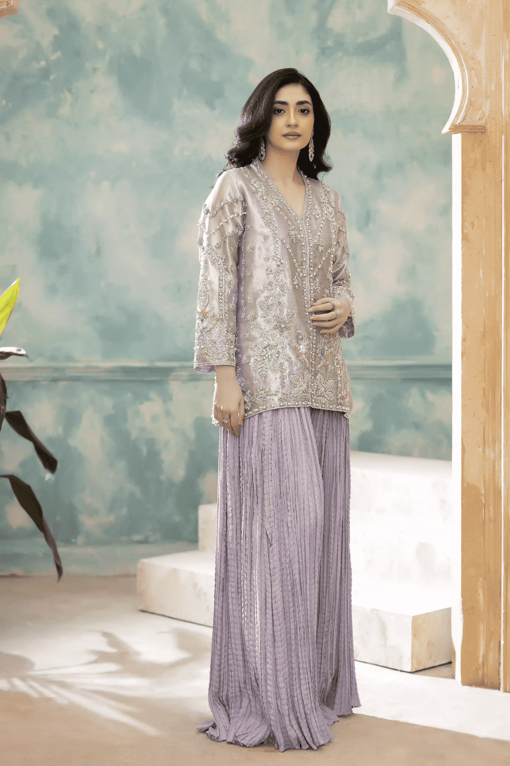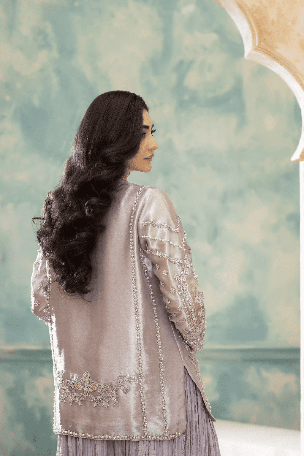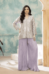 The jacket is finished with shimmering borders on the sleeves and hem, paired with voluminous crushed sharara pants in a coordinating lilac shade for a modern yet ethereal look.
