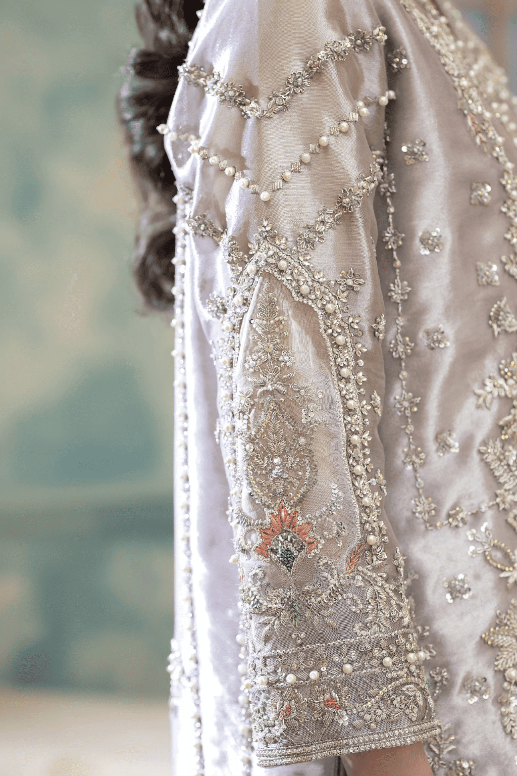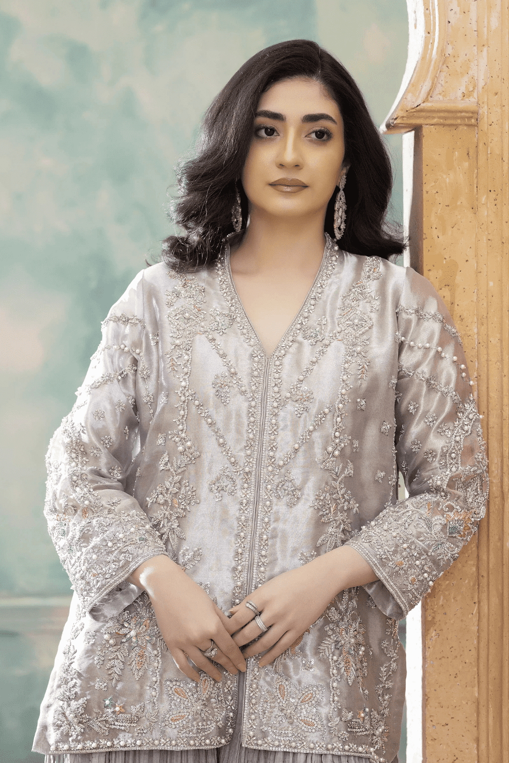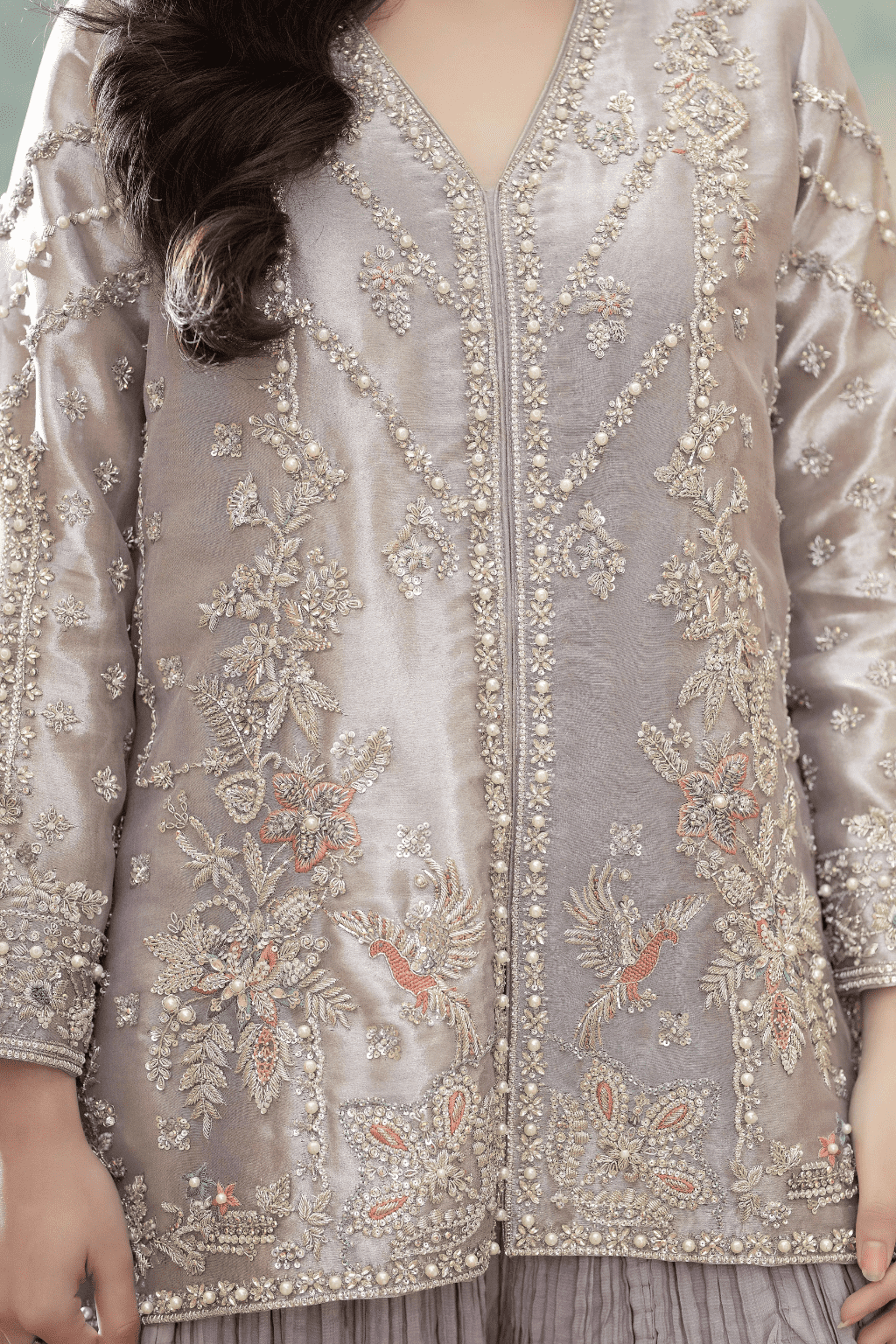 A sophisticated lilac ensemble featuring a short organza jacket adorned with intricate silver hand-embellishments and delicate floral motifs.