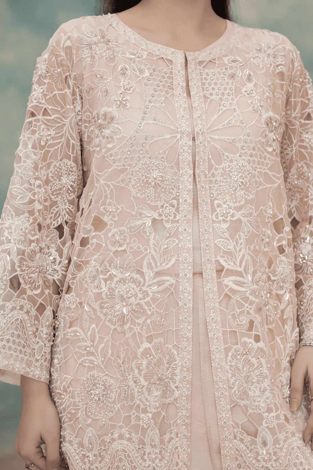 Design: Open-front jacket silhouette with detailed floral cutwork.